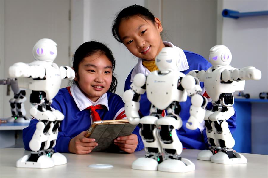 12月19日,武安市淑村鎮(zhèn)白沙學(xué)校的學(xué)生在練習(xí)操作機器人。新華社記者王曉攝