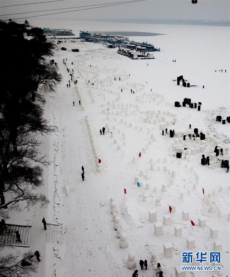 在松花江哈爾濱段江面上,制作中的部分雪人(12月21日無人機(jī)拍攝)。新華社記者王松攝