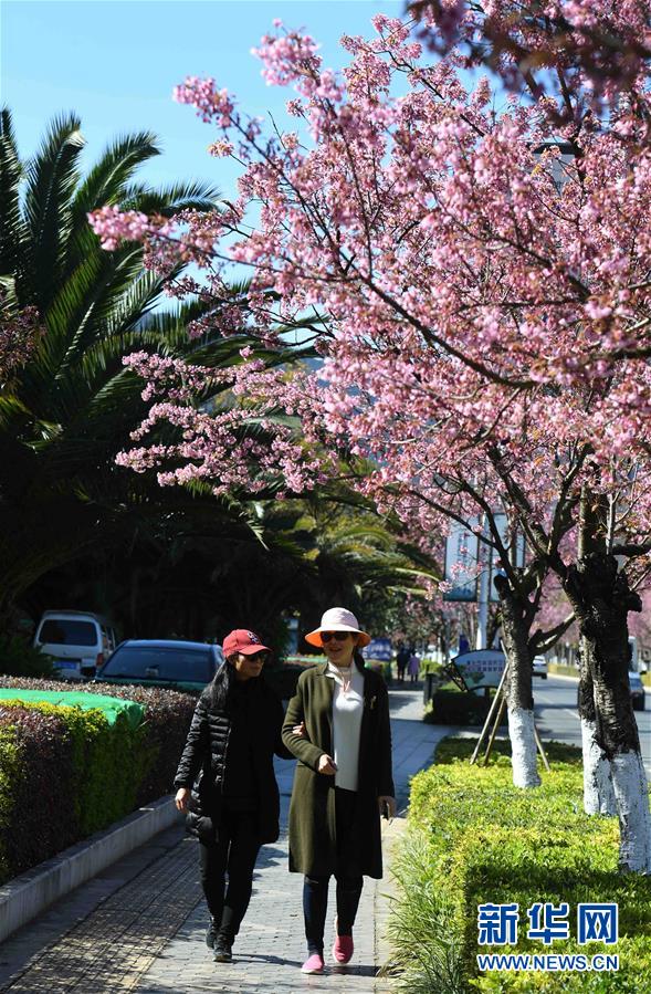 12月21日,游客行走在昆明市西山區(qū)櫻花盛開(kāi)的人行道上。新華社記者楊宗友攝