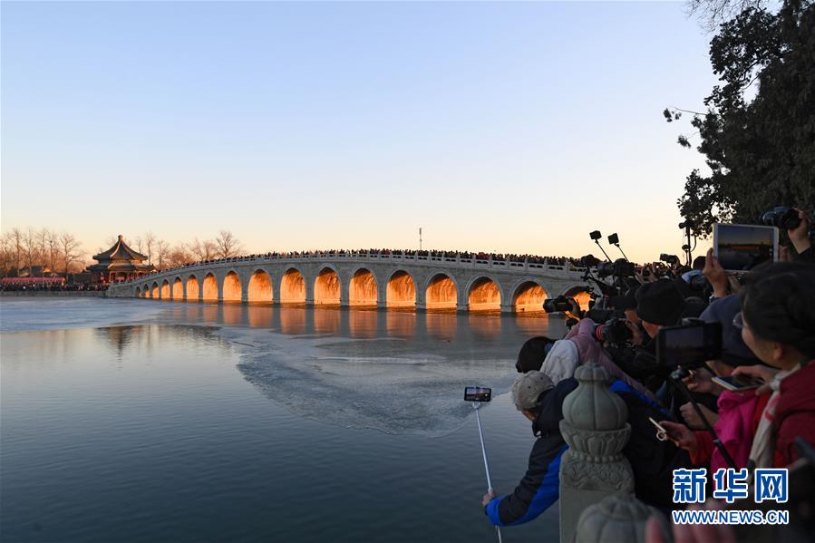 12月23日,游客和攝影愛好者在拍攝頤和園十七孔橋“金光穿洞”美景。 當(dāng)日,北京頤和園十七孔橋出現(xiàn)“金光穿洞”美景,吸引許多游客和攝影愛好者前來(lái)觀賞拍攝。 新華社記者陳曄華攝