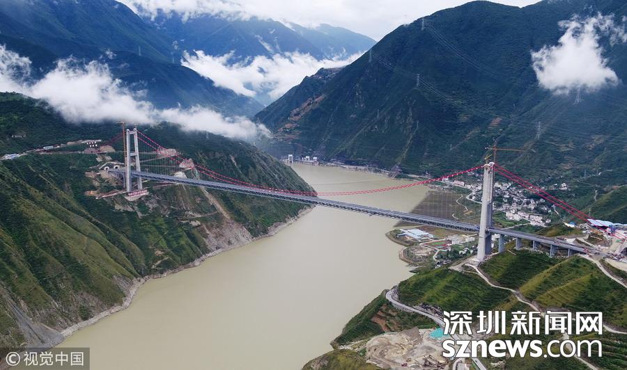大橋擁有2個(gè)“第一”:主跨1100米,成為川藏在建第一大跨徑鋼桁梁懸索橋;雅安岸隧道式錨碇長(zhǎng)159米,更是成為世界上在建第一長(zhǎng)。