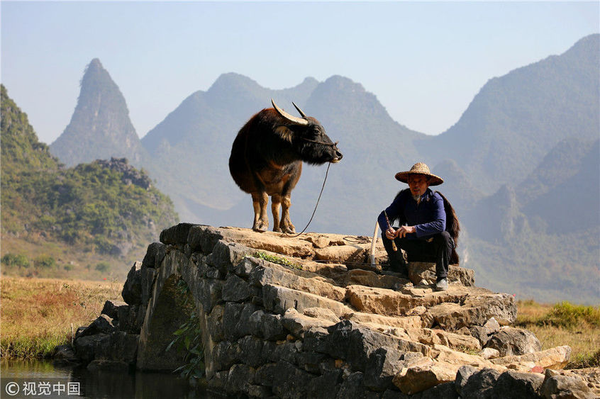 2018年12月17日,廣西桂林。用不到3年時間,農(nóng)民許修保愣是將自己家的水牛訓(xùn)練得走上了貓步,這讓來自全國各地的游客嘖嘖稱奇:你這么牛,維密天使情何以堪?憑著與水牛的聯(lián)袂演出,一個月下來,老許會有兩三萬的收入進(jìn)賬,佩服得左鄰右舍紛紛向他伸出了大拇指。棋簿紫/視覺中國