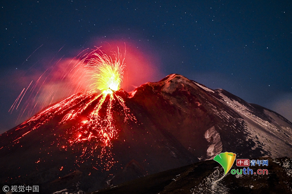 意大利埃特納火山噴發(fā) 大量巖漿照亮火山口