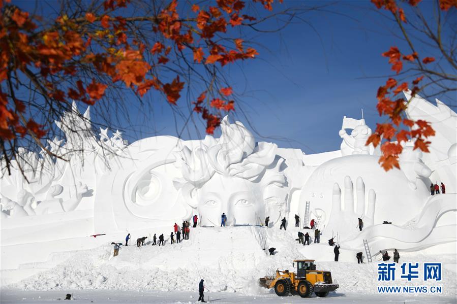 12月24日,雪雕師在制作太陽島雪博會主塑“星河之旅”。 當(dāng)日,哈爾濱太陽島雪博會主塑露出“芳容”。本屆雪博會主塑“星河之旅”長106米,高32米,寬20米,用雪量達(dá)4萬立方米。 新華社記者 王建威 攝