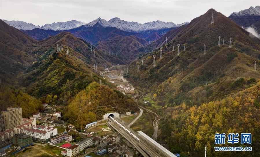 11月5日,一列動(dòng)車從陜西省漢中市佛坪站駛過(無人機(jī)拍攝)。 新華社記者陶明攝