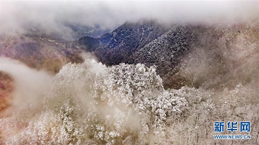 云霧中的鬼谷嶺國家森林公園山頂白雪皚皚,山腰秋色正濃(11月8日無人機(jī)拍攝)。 新華社記者陶明攝