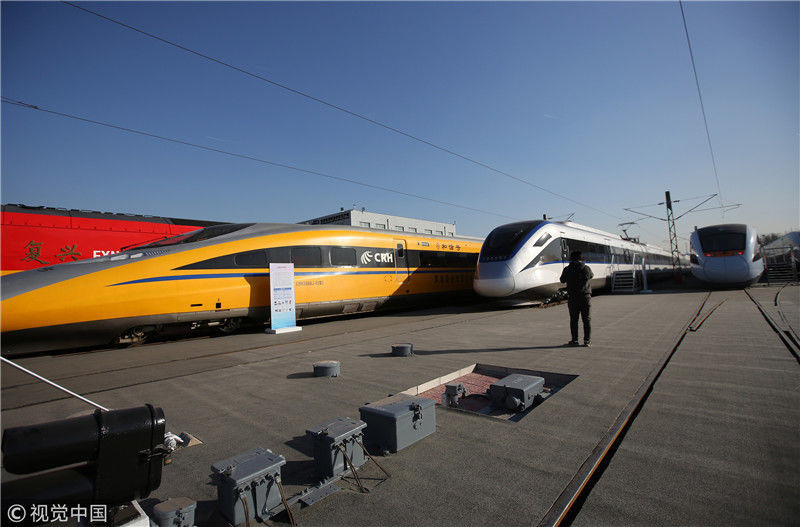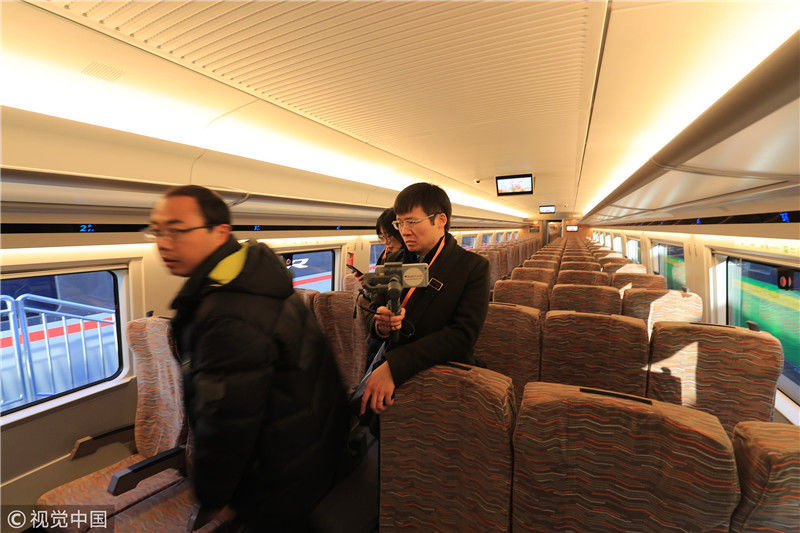 2018年12月24日,北京,中國(guó)鐵路科技創(chuàng)新成果展在國(guó)家鐵道試驗(yàn)中心舉行。新型復(fù)興號(hào)動(dòng)車組實(shí)車首次公開(kāi)亮相,現(xiàn)場(chǎng)體驗(yàn)乘車運(yùn)行。視覺(jué)中國(guó)