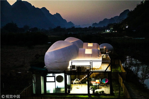 2018年12月17日,廣西桂林,陽朔縣遇龍河畔。夜色中的泡泡屋。