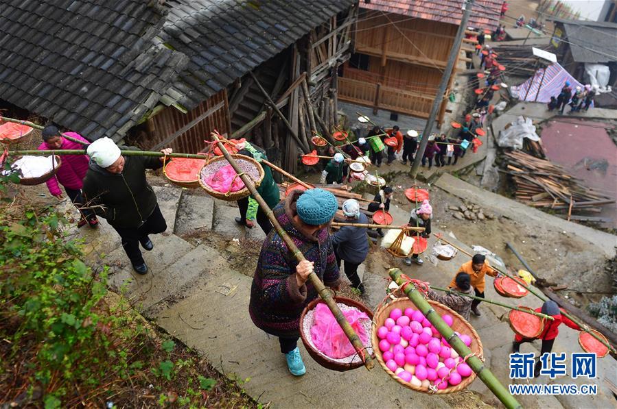 為慶祝小孩滿月,父母帶著送禮隊(duì)伍拜望外公外婆(2月24日攝)。