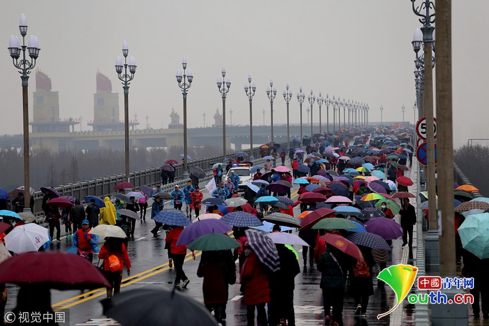 2018年12月26日,南京。南京長(zhǎng)江大橋維修改造工程竣工通車在即,12月26日至28日三天向公眾開放,12月26日,“市民開放日”首日,早晨九時(shí)許,雖然下著雨,但記者在南京長(zhǎng)江大橋入口和橋上看到,如織的市民打著傘來到大橋,整個(gè)橋上全是撐傘觀看的市民,足有萬人,十分壯觀。