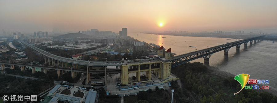 2017年9月19日,南京長(zhǎng)江大橋正橋的混凝土面板已經(jīng)全部拆除,僅剩交錯(cuò)縱橫的鋼桁架橫跨在長(zhǎng)江之上,從高空俯瞰猶如一條“鋼鐵巨龍”。