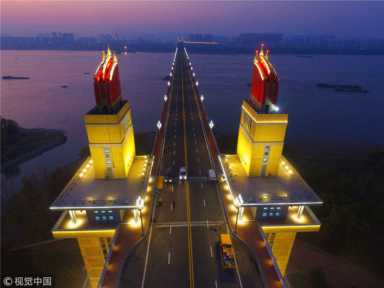 2018年12月13日,江蘇南京,“一橋飛架南北,天塹變通途?!弊鳛槲覈?guó)第一座自行設(shè)計(jì)和建造的雙層鐵路、公路兩用橋,南京長(zhǎng)江大橋在我國(guó)橋梁史上的重要地位不言而喻。從1968年建成后的48年間,它就如同一條巨龍,始終在長(zhǎng)江上默默守護(hù)著人來車往。南京長(zhǎng)江大橋上層是公路橋,下層為雙軌復(fù)線鐵路橋,連接津浦鐵路與滬寧鐵路干線,是我國(guó)南北交通要津和命脈。近年來,由于南京長(zhǎng)江大橋公路橋的實(shí)際通行荷載遠(yuǎn)超原先設(shè)計(jì)標(biāo)準(zhǔn),不僅橋面上擁堵常現(xiàn),橋梁本身的種種“病害”也日益加深。圖為2018年12月13日,夜幕降臨,南京長(zhǎng)江大橋歸位后的玉蘭花燈重新點(diǎn)亮。大橋玉蘭花燈柱共有299根,每根燈柱上有5盞玉蘭花燈,1大4小,一共1495盞。方東旭/視覺中國(guó)