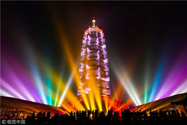 2017年12月31日跨年夜,南京,大報恩寺遺址公園內的大報恩塔塔身投影出“你好2018”的字樣,眾多市民前來撞鐘,為家人和朋友祈福,迎接新年。