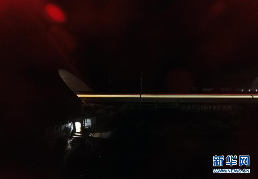 一列動(dòng)車夜間穿越花甲山隧道進(jìn)入壇柱隧道(左)(2月11日無人機(jī)航拍)。廣西南寧市前往北部灣沿海城市的鐵路,穿越巍巍群山,列車飛馳其間需要穿過大批隧道,僅南寧市到北海市的鐵路隧道就有18個(gè)。