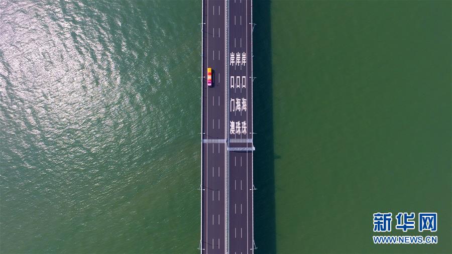 10月24日,一輛巴士行駛在港珠澳大橋上(無人機(jī)拍攝)。當(dāng)日,港珠澳大橋正式通車。