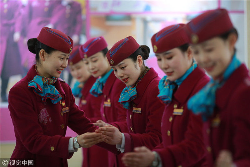 2018年12月27日,四川成都,為備戰(zhàn)即將開通的成雅鐵路,中國鐵路成都局集團有限公司成都客運段動車二隊對成雅動車的乘務人員進行理論、形體、服務禮儀等內容的培訓。