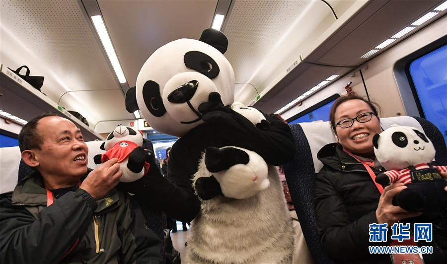 12月28日,在成都西至雅安的C6651次列車上,“熊貓”與旅客們互動。