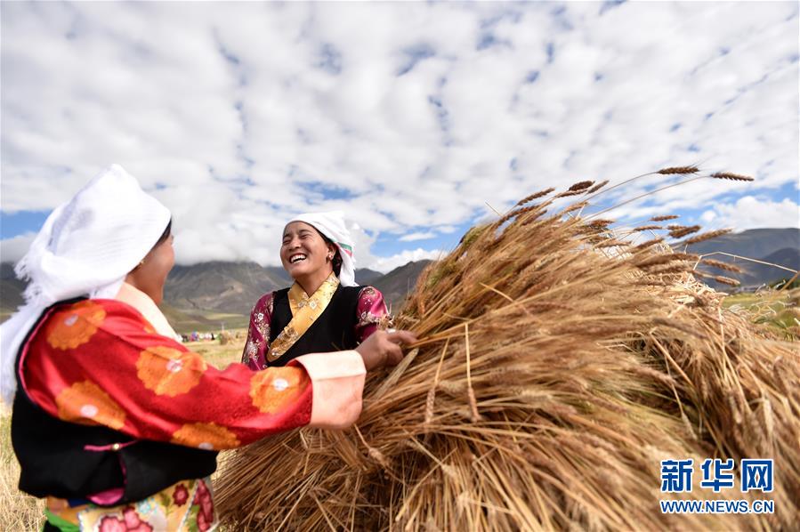 9月23日,首個中國農民豐收節(jié),拉薩市林周縣松盤鄉(xiāng)松盤村兩名藏族農民在田間聊天。 新華社記者 覺果 攝