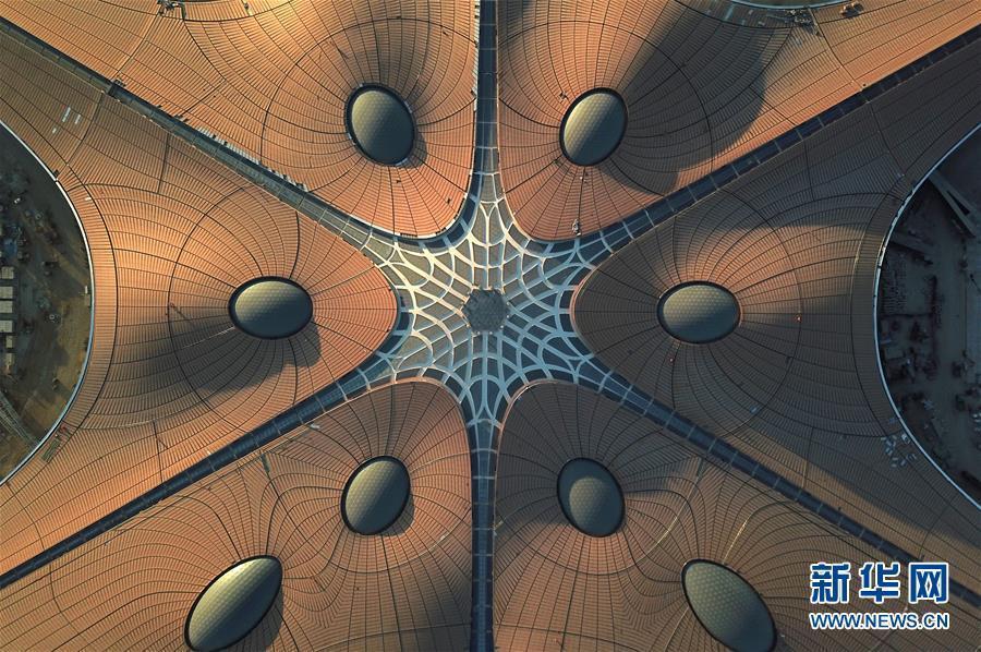 12月29日拍攝的北京大興國際機(jī)場(無人機(jī)拍攝)。 當(dāng)日,在北京大興國際機(jī)場,隨著清晨第一縷陽光灑在航站樓古銅色的屋頂上,寓意“鳳凰展翅”的航站樓呈現(xiàn)出金光燦燦的景象。 新華社記者 鞠煥宗 攝 圖片來源:新華網(wǎng)