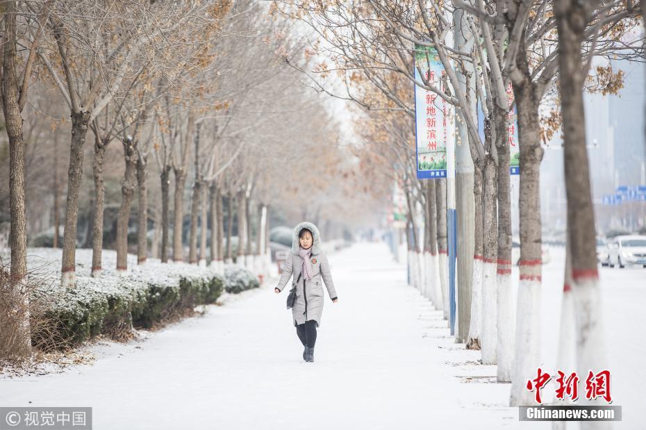 山東濱州發(fā)布道路結(jié)冰黃色預(yù)警信號(hào)市區(qū)出現(xiàn)較明顯降雪,路表溫度低于0℃。圖片來(lái)源:視覺(jué)中國(guó)