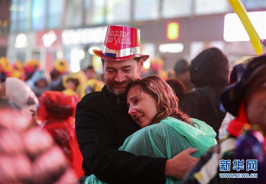 1月1日,在美國(guó)紐約時(shí)報(bào)廣場(chǎng),一對(duì)情侶在新年鐘聲敲響后擁抱。 新華社記者王迎攝