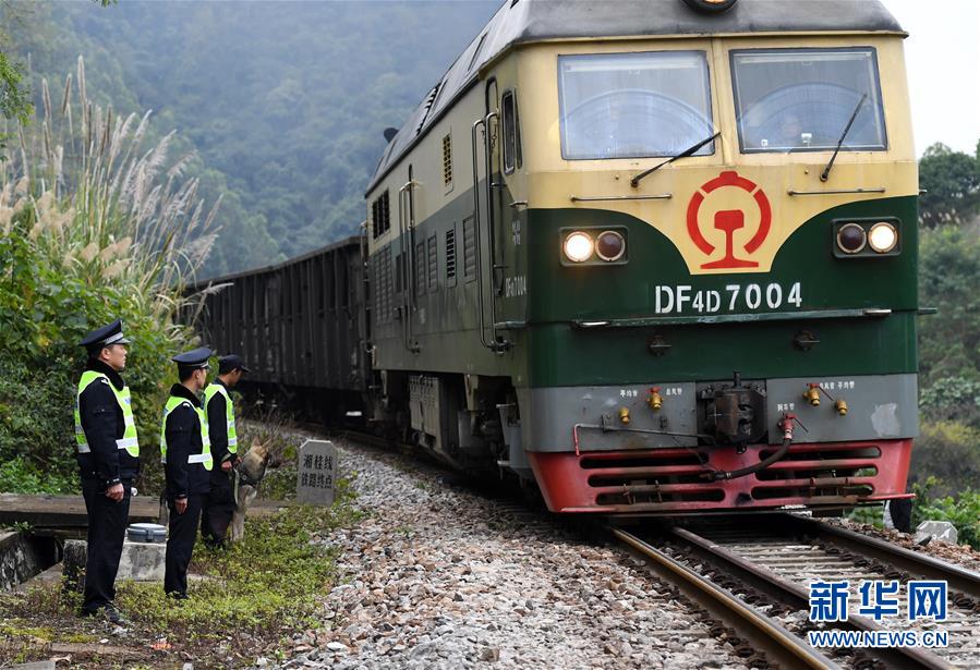 鐵路公安民警陸日峰(左一)和同事目送著一列火車通過湘桂線鐵路終點從越南進入中國(2018年12月31日攝)。新華社記者陸波岸攝