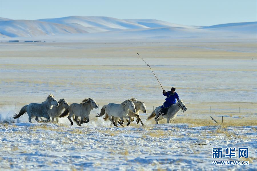 1月8日,牧民進(jìn)行套馬表演。 時下正值草原冬季旅游旺季,內(nèi)蒙古自治區(qū)西烏珠穆沁旗的牧民們在雪原上一展身手,為游客展現(xiàn)獨(dú)特的民族風(fēng)情。 新華社記者 鄒予 攝