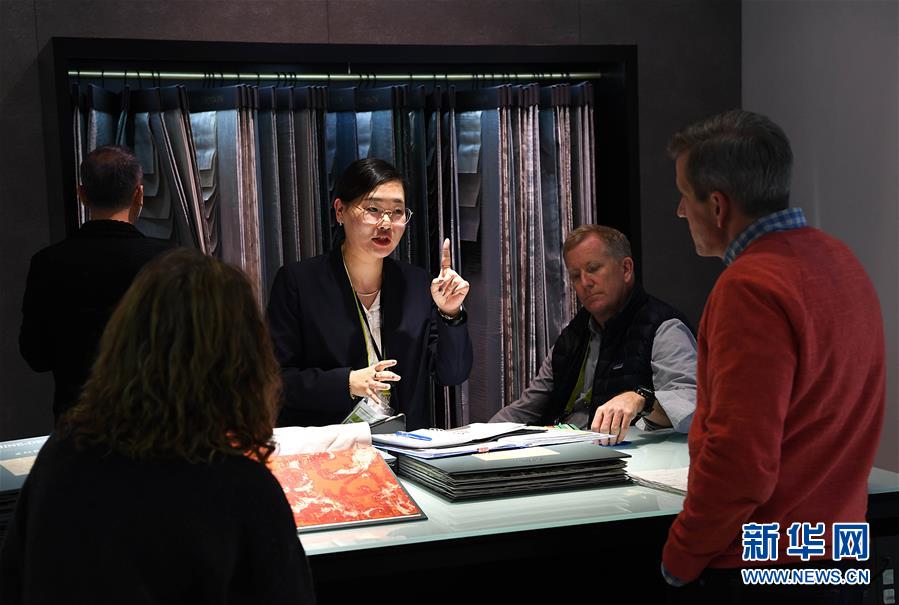 1月8日,在德國法蘭克福家紡展上,參觀者與一家來自中國的展商洽談。 新華社記者 逯陽 攝