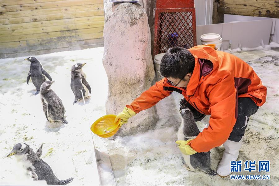 1月9日,馴養(yǎng)員給白眉企鵝寶寶喂食。 新華社記者 潘昱龍 攝