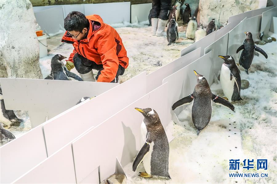 1月9日,馴養(yǎng)員給白眉企鵝寶寶喂食,成年白眉企鵝在隔離板外關(guān)注自己的寶寶。 新華社記者 潘昱龍 攝