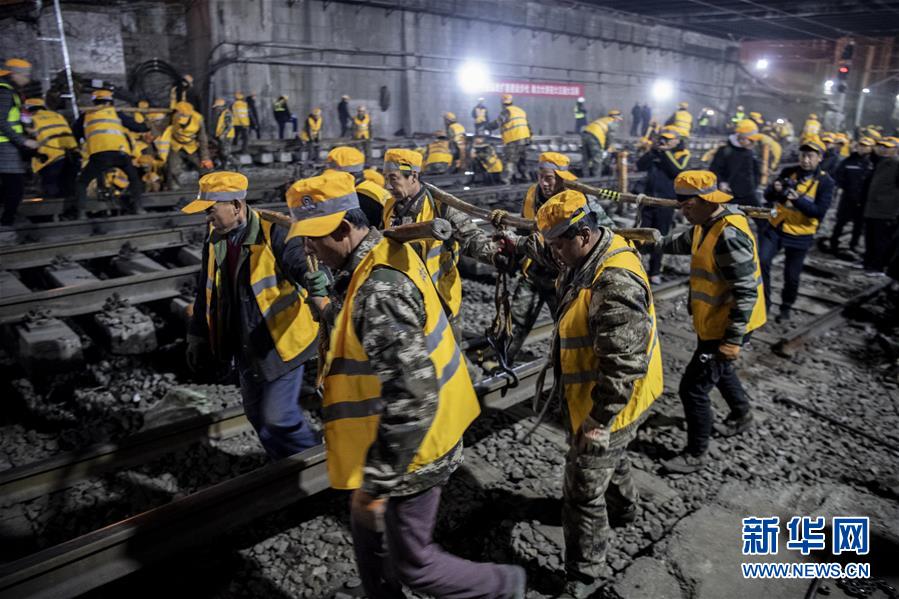 1月15日凌晨,中鐵十一局施工人員在西安站改現(xiàn)場抬運鋼軌。新華社記者陶明攝