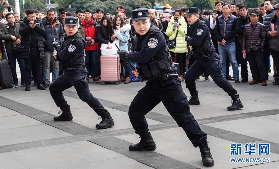 1月16日,旅客在觀看民警技能演練。 當日,武漢鐵路公安處在漢口火車站舉行警營開放日活動,讓旅客零距離接觸警務(wù)安全工作,營造良好的春運出行環(huán)境。 新華社記者程敏攝