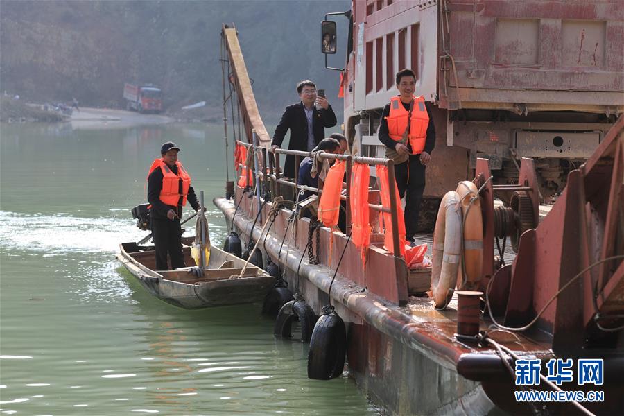 1月22日,何銀祥(左)在駕駛小船,他駕駛的小船是大船的動(dòng)力來(lái)源。 新華社記者 歐東衢 攝