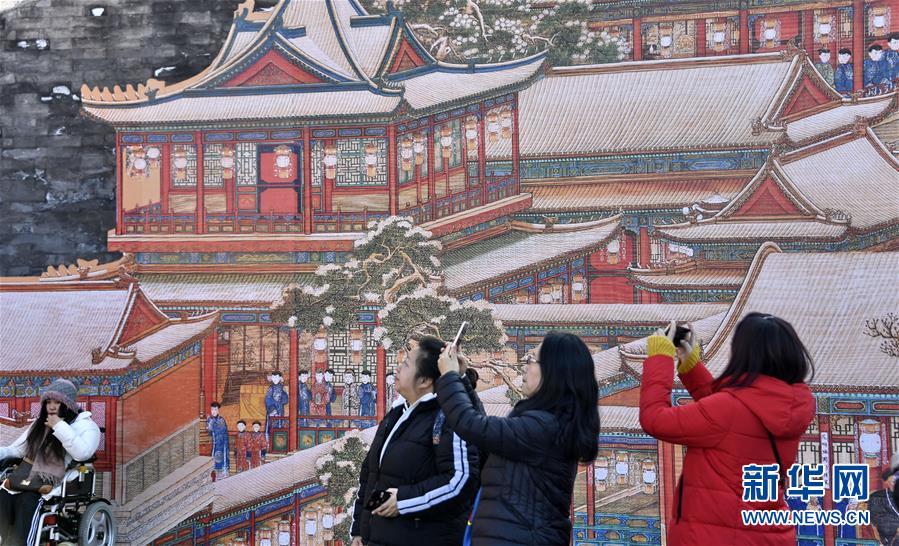 1月25日,游人在故宮內(nèi)拍攝古代宮廷過春節(jié)的繪畫。 春節(jié)將至,北京故宮博物院內(nèi)張燈結彩,到處懸掛著宮燈、萬壽燈、年畫、門神、福字等古代宮廷節(jié)日裝飾品,讓來自國內(nèi)外的游人感受到濃濃的年味。 新華社記者 李欣攝