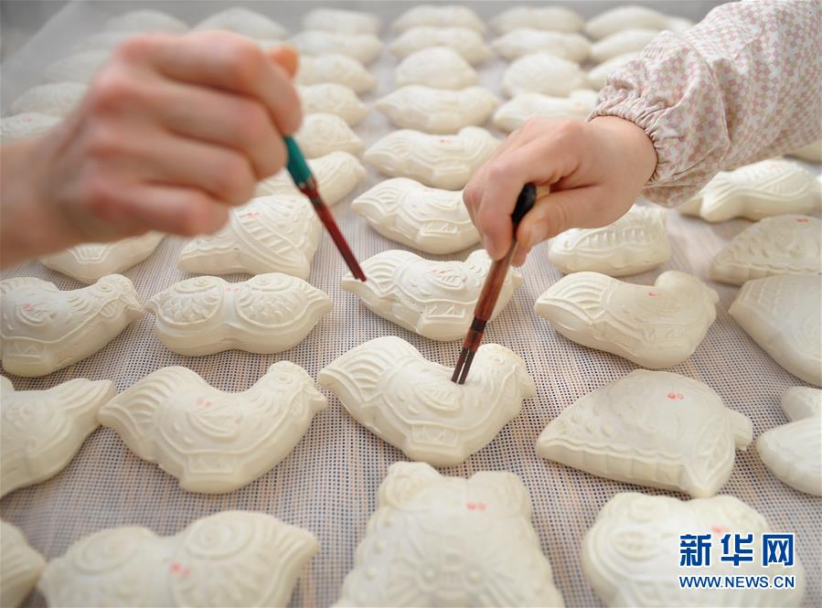 1月31日,河北省黃驊市一家面花作坊的工人給剛剛出籠的面花點(diǎn)上寓意吉祥喜慶的紅點(diǎn)。 河北黃驊市有著過年蒸面花的習(xí)俗。春節(jié)前夕,當(dāng)?shù)孛婊ㄖ谱鞴S加班加點(diǎn)制作面花,供應(yīng)春節(jié)市場。 新華社記者牟宇攝