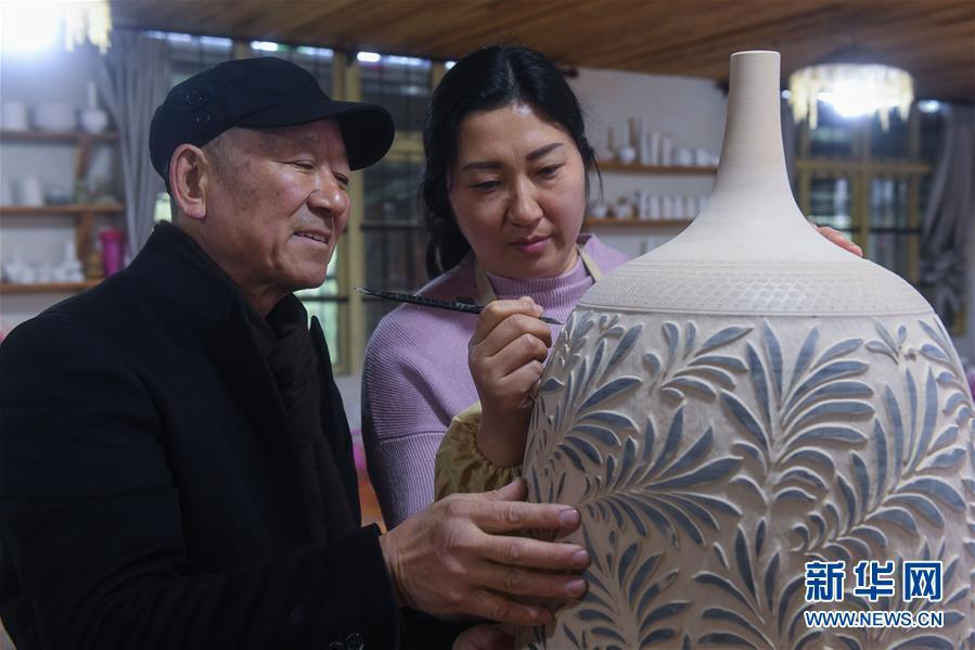 2月16日,陳新華(左)在指導(dǎo)徒弟進(jìn)行刻花創(chuàng)作。新華社記者 徐昱 攝
