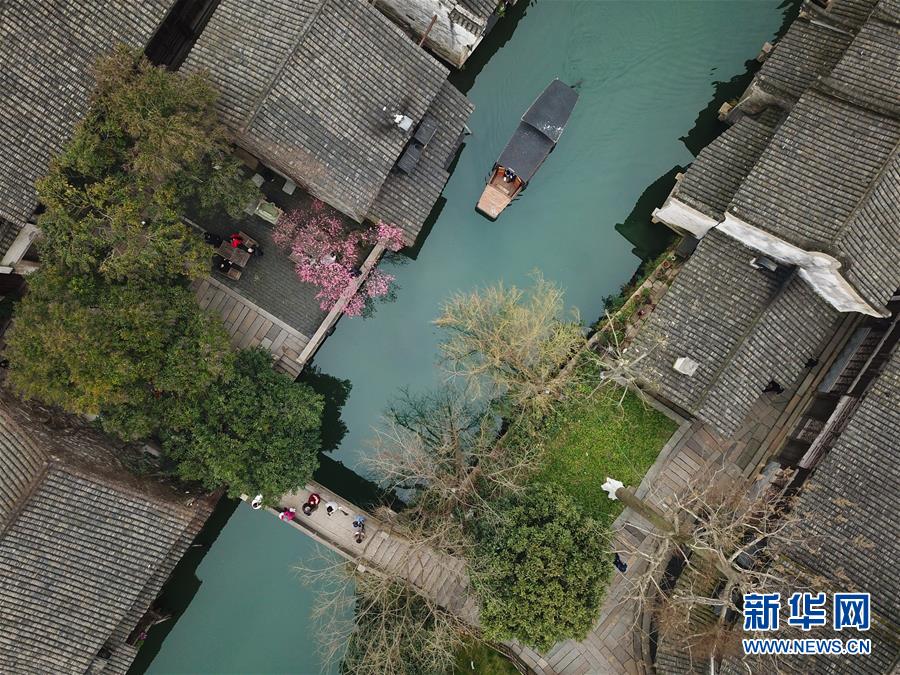 2月25日,游人在烏鎮(zhèn)游覽觀光(無(wú)人機(jī)拍攝)。 隨著氣溫升高,浙江省桐鄉(xiāng)市烏鎮(zhèn)景區(qū)春意萌動(dòng)。 新華社記者翁忻旸攝