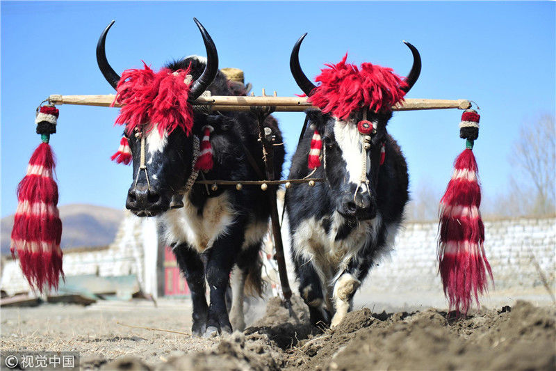 圖為白朗縣洛江鎮(zhèn)村民開耕犁出新年的第一壟青稞田,據(jù)悉,每年開耕節(jié)上,農牧民都會裝扮自家的耕牛。