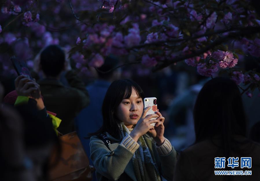 3月31日,游客在中國(guó)科學(xué)技術(shù)大學(xué)東區(qū)為櫻花樹下的同伴拍照。