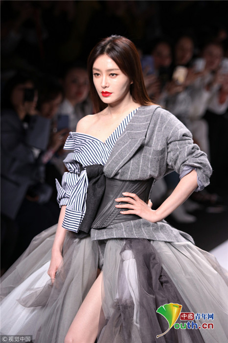 2019年3月31日,上海,2019上海秋冬時(shí)裝周,秦嵐助陣古巨基自創(chuàng)品牌大秀。她穿西裝紗紗裙笑容滿面可鹽可甜,斜肩小西裝正好能露出天鵝頸的線條,性感又不失知性?!拔灏⒏纭惫啪藁鶆t穿著隨性,與“知畫(huà)”牽手走秀,引起滿滿“回憶殺”。