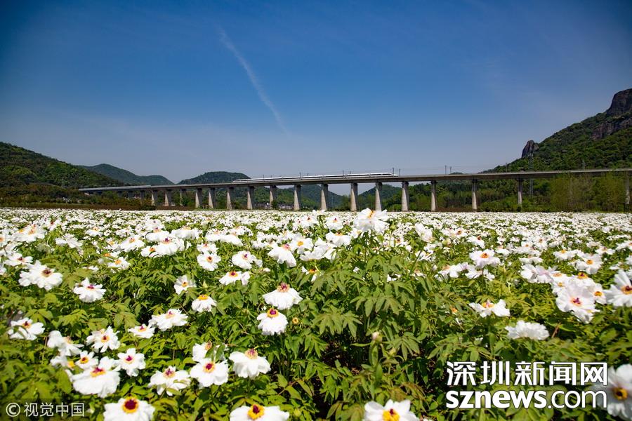 2019年4月8日,一列高鐵列車從京福高鐵安徽銅陵段一片盛開的鳳丹花海中駛過。隨著氣溫回升,安徽省銅陵市境內的鳳丹競相綻放,高鐵列車穿行其間,成為春日里一道美麗的風景線。