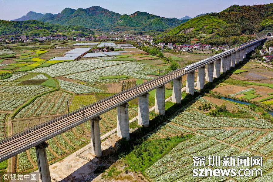 2019年4月8日,一列高鐵列車從京福高鐵安徽銅陵段一片盛開的鳳丹花海中駛過。隨著氣溫回升,安徽省銅陵市境內(nèi)的鳳丹競相綻放,高鐵列車穿行其間,成為春日里一道美麗的風(fēng)景線。