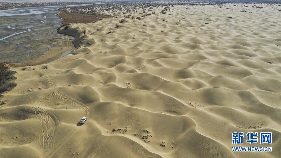 依明乘坐的汽車行駛在塔克拉瑪干沙漠中。從依明家坐車前往于田縣城,全程不足300公里,越野車需行駛7小時左右(3月19日無人機拍攝)。