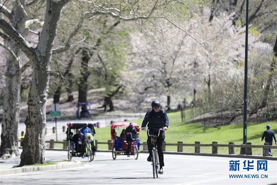 4月16日,一名男子在美國(guó)紐約中央公園騎行。 新華社記者 王迎 攝