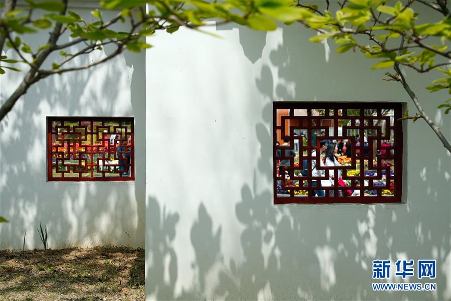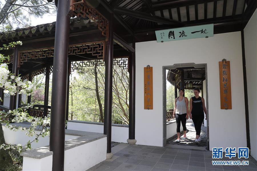 2017年4月28日,游客在美國(guó)紐約寄興園內(nèi)游覽。仿照中國(guó)蘇州園林設(shè)計(jì)建造的寄興園位于紐約斯塔滕島,占地面積約4000平方米,其所用的建筑材料大都在蘇州加工制造,并由40名來(lái)自蘇州的藝術(shù)家和工匠歷時(shí)6個(gè)月在紐約修建而成。 新華社記者王迎攝