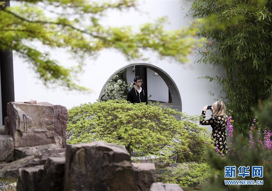 2019年4月13日,在德國(guó)曼海姆,游客在中式園林“多景園”內(nèi)拍照?!岸嗑皥@”位于曼海姆市路易森公園內(nèi),占地約6000平方米,建筑面積約1500平方米,是目前歐洲最為完整的中國(guó)古典園林建筑群落之一。 新華社記者逯陽(yáng)攝
