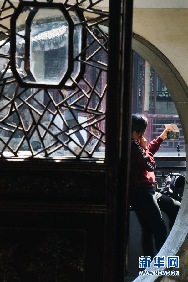 2019年4月1日,一名游客在中國(guó)蘇州耦園內(nèi)拍照。2000年,耦園和滄浪亭、藝圃、獅子林、退思園作為蘇州古典園林的擴(kuò)展項(xiàng)目被列入聯(lián)合國(guó)教科文組織世界文化遺產(chǎn)名單。 新華社記者杜涓涓攝