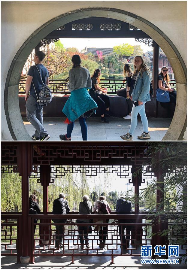 這張拼版照片展示的是:上圖,2019年4月1日,外籍游客在中國(guó)蘇州網(wǎng)師園內(nèi)游覽(新華社記者杜涓涓攝);下圖,2019年4月17日,游客在德國(guó)柏林中式園林“得月園”內(nèi)游覽(新華社記者單宇琦攝)。
