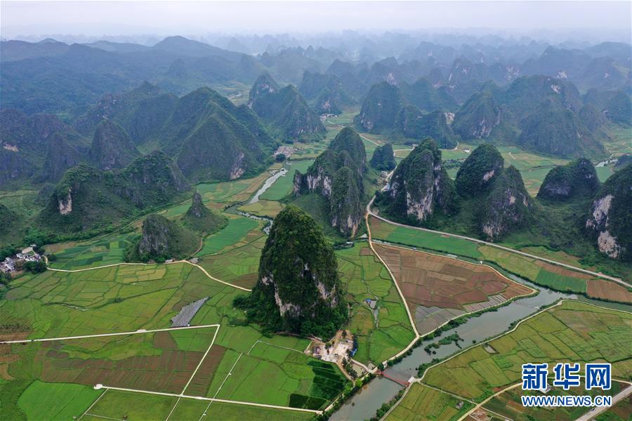 這是廣西靖西市新靖鎮(zhèn)境內(nèi)的田園風(fēng)光(4月16日無人機(jī)拍攝)。 新華社記者 陸波岸 攝