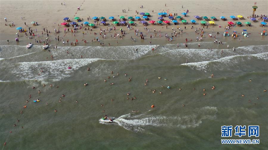 眾多游客在北海銀灘游玩(4月16日無人機拍攝)。新華社記者張愛林攝